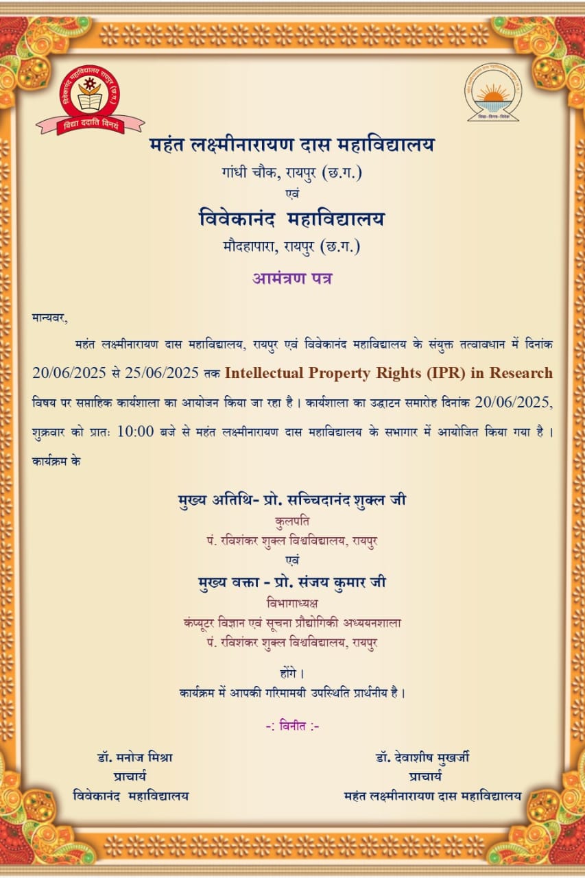 रायपुर महन्त कॉलेज एवम विवेकानंद महाविद्यालय रायपुर के संयुक्त तत्वाधान में बौद्धिक संपदा अधिकार एवम शोध के सम्बन्ध विषय पर छः दिवसीय कार्यशाला का आयोजन 20 जून से किया जा रहा है कार्यक्रम के मुख्य अतिथि प्रो सच्चिदानंद शुक्ल कुलपति ,प रविशंकर शुक्ल विश्विद्यालय होंगे इस कार्यशाला के प्रथम दिन के विशेषज्ञ के रूप में प्रो संजय कुमार, अध्यक्ष कंप्यूटर साइंस विभाग पंडित रविशंकर शुक्ल विश्वविद्यालय एवम अन्य दिनों में डॉक्टर देवव्रत मित्रा कुलपति ,दक्षिण दीनाजपुर विश्वविद्यालय पश्चिम बंगाल, प्रोफेसर डॉक्टर देवाश्री मुखर्जी कॉमर्स एंड बिजनेस स्टडी जामिया मिलिया इस्लामिया विश्वविद्यालय नई दिल्ली एवं डॉक्टर विशाल कौशिक असिस्टेंट प्रोफेसर पेट्रोलियम और ऊर्जा अध्ययन विश्वविद्यालय देहरादून उत्तराखंड की विशेष मौजूदगी रहेगी इस कार्यक्रम में शिक्षण समिति के अध्यक्ष अजय तिवारी महासचिव अनिल तिवारी महंत लक्ष्मी नारायण दास महाविद्यालय के प्राचार्य डॉक्टर देवाशीष मुखर्जी और विवेकानंद महाविद्यालय के प्राचार्य डॉक्टर मनोज मिश्रा की उपस्थिति भी मुख्य रूप से होगी इस पूरे आयोजन में बौद्धिक संपदा अधिकार पर विस्तार से चर्चा होगी और एक संक्षिप्त रिपोर्ट तैयार की जाएगी जिसे छत्तीसगढ़ शासन की शिक्षा विभाग को प्रस्तुत किया जाएगा ।