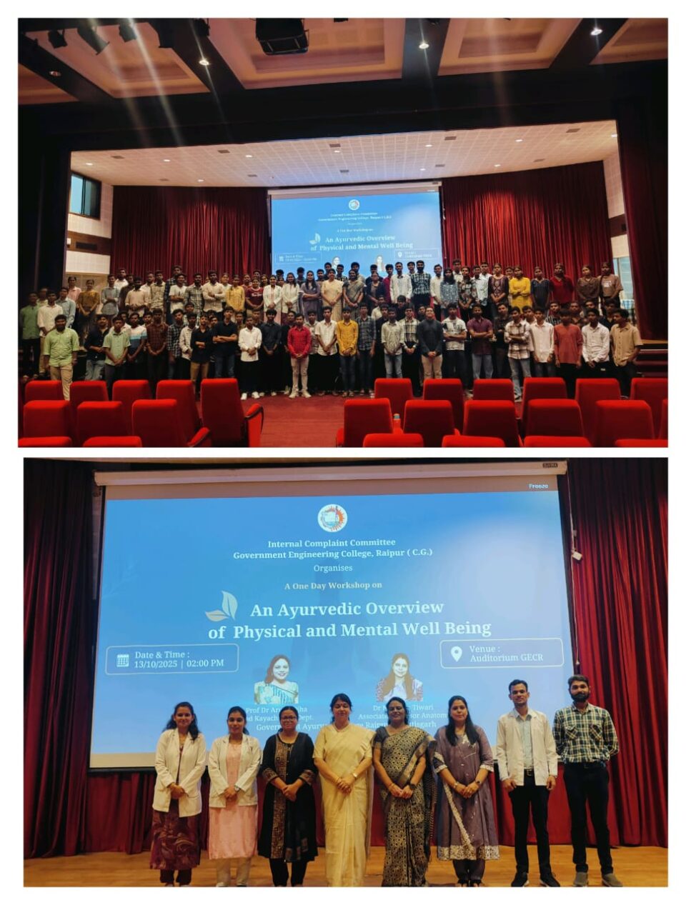शासकीय अभियांत्रिकी महाविद्यालय, रायपुर में छत्तीसगढ़ राज्य के रजत जयंती वर्ष के अवसर पर “एन आयुर्वेदिक ओवरव्यू ऑफ फिजिकल एंड मेंटल वेल-बीइंग” विषय पर एक दिवसीय कार्यशाला का आयोजन 13 अक्टूबर 2025 को आंतरिक शिकायत समिति के तत्वावधान में किया गया। कार्यक्रम की शुरुआत माँ सरस्वती की प्रतिमा पर पुष्पांजलि और दीप प्रज्वलन से हुई, जिससे पूरे माहौल में सकारात्मक ऊर्जा का संचार हुआ।
