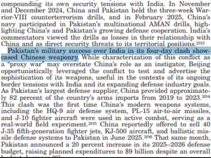 अमेरिकी US-China Economic & Security Review Commission (USCC) की 800 पन्नों की रिपोर्ट में दावा किया गया है कि मई 2025 में भारत और पाकिस्तान के बीच हुई 4 दिन की लड़ाई (ऑपरेशन सिंदूर) में पाकिस्तान को बड़ी सैन्य बढ़त मिली। रिपोर्ट में लिखा है कि पाकिस्तान ने इस संघर्ष में चीन से मिले हथियार—जैसे HQ-9 एयर डिफेंस सिस्टम, PL-15 मिसाइलें और J-10 फाइटर जेट—का इस्तेमाल किया।