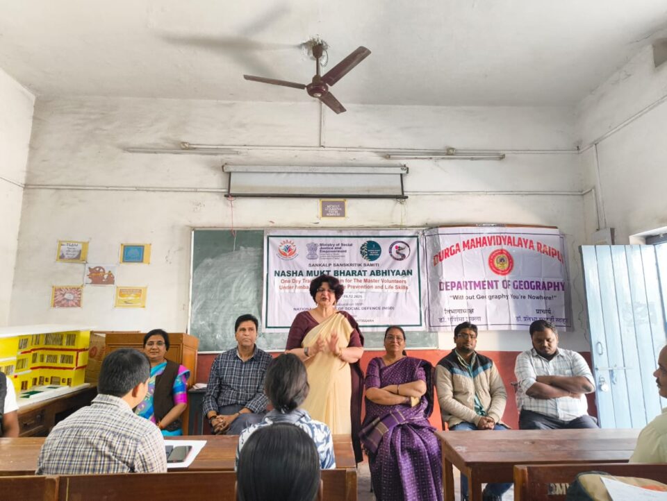 मिनिस्ट्री ऑफ़ सोशल जस्टिस एंड एंपावरमेंट कल सपोर्ट से स्टेट लेवल कोऑर्डिनेटिग एजेंसी, छत्तीसगढ़ ने नशा मुक्ति भारत अभियान के मास्टर वॉलिंटियर्स के बीच एक दिन का ट्रेंनिंग प्रोगाम ऑर्गेनाइज् किया जिसमें राष्ट्रीय सेवा योजना एवं भूगोल विभाग के विद्यार्थियों ने भाग लिया कार्यक्रम में डॉक्टर प्रतिभा मुखर्जी साहूकार प्राचार्य दुर्गा महाविद्यालय ने कहा कि आज की युवा पीढ़ी को नशे से दूर रहना चाहिए विभाग अध्यक्ष भूगोल विभाग डॉक्टर पूर्णिमा शुक्ला ने कहा कि नशा करने से वह व्यक्ति शारीरिक और मानसिक रूप से कमजोर नहीं होता बल्कि पूरा परिवार बर्बाद हो जाता है कार्यक्रम का संचालन एवं आभार प्रदर्शन राष्ट्रीय सेवा योजना की कार्यक्रम अधिकारी सुनीता चंसोरिया ने विद्यार्थियों से कहा कि वह अपने घर एवं पास पड़ोस के लोगों को नशे के दुष्प्रभाव बढ़कर जागरूक करें डॉक्टर चुन्नीलाल शर्मा ,संकल्प सांस्कृतिक समिति रायपुर, ने नशा के दुष्प्रभाव एवं इनसे कैसे बचाव किया जा सकता है इसकी जानकारी दी सौरव तिवारी प्रोजेक्ट कोऑर्डिनेटर स्टेट लेवल कोऑर्डिनेटिग एजेंसी, छत्तीसगढ़ में नशा मुक्त भारत अभियान के बारे में जानकारी दी राजकमल रात्रि ट्रेनर कम काउंसलर संकल्प कम्युनिटी बेस्ड पीयर लेड इंटरवेंशन के बारे में जानकारी दी अरुण मिंज पियर एजुकेटर संकल्प एकीकृत नशा मुक्ति एवं पुनर्वास के बारे में जानकारी दी कार्यक्रम में भूगोल विभाग के प्राध्यापक गण एवं विद्यार्थियों की सहभागिता रही