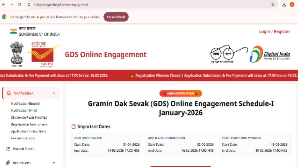 भारतीय डाक विभाग द्वारा ग्रामीण डाक सेवक (GDS) भर्ती 2026 की प्रक्रिया अपने अंतिम चरण में पहुंच चुकी है। इस भर्ती अभियान के तहत देशभर में कुल 28,740 रिक्त पदों को भरा जाना है, जिसके लिए बड़ी संख्या में युवाओं ने पंजीकरण कराया है। विभाग ने स्पष्ट किया है कि जिन अभ्यर्थियों ने निर्धारित समय सीमा के भीतर रजिस्ट्रेशन तो कर लिया था, लेकिन किसी कारणवश अपना आवेदन पत्र अंतिम रूप से सबमिट नहीं कर पाए, उन्हें अब एक अंतिम अवसर प्रदान किया जा रहा है।