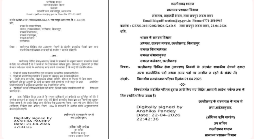 रायपुर में छत्तीसगढ़ सरकार ने सरकारी कर्मचारियों को राजनीति से दूर रहने का आदेश जारी किया था। इसमें कहा गया था कि कोई भी कर्मचारी किसी राजनीतिक दल का सदस्य नहीं बनेगा और बिना अनुमति किसी संगठन में पद नहीं लेगा। नियम तोड़ने पर कार्रवाई की चेतावनी भी दी गई थी।